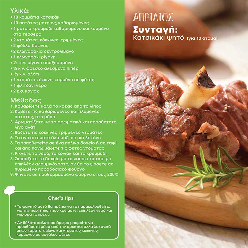 Χάρη στις σελίδες του Γαστρονομικού ημερολογίου, δημιουργήστε Κυπριακά πιάτα με τα υλικά της κάθε εποχής, μέσα από εύκολες συνταγές. Για τον Απρίλιο προτείνουμε κατσικάκι ψητό!