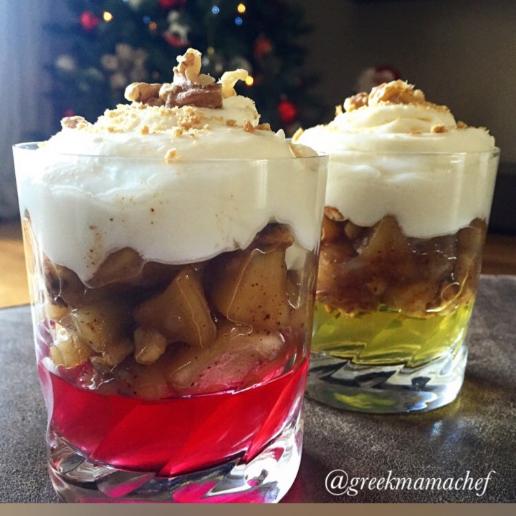 Φτιάξτε ζελέ της αρεσκείας σας και χωρίστε το σε ποτήρια στο 1/3. Αφήστε το να δέσει για τουλάχιστον δύο ώρες. Στη συνέχεια, προσθέστε γέμιση στη μέση. Η γέμιση μπορεί να είναι από οποιασδήποτε επιδόρπιο που σας έχει απομείνει! Μην περιοριστείτε σε αυτό. Απλά αυτός ο συνδυασμός καραμελωμένων φρούτων με καρύδια και σταφίδες είναι δοκιμασμένο και θα δώσει μια επιπλέον εορταστική αίσθηση μέσα στον χειμώνα!
