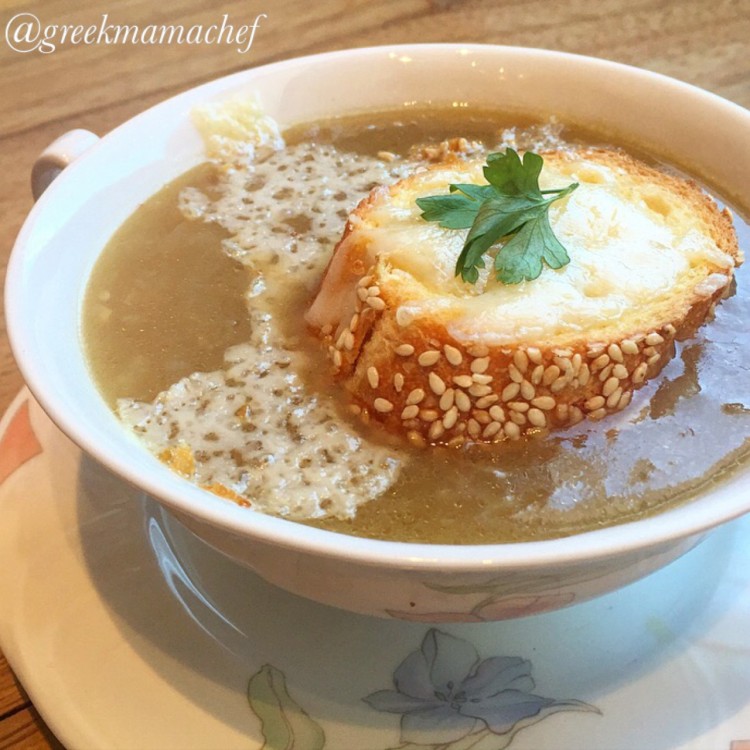 - Για να σερβίρετε, βαλτε την σούπα σε ένα μπολ και απο πάνω τοποθετίστε ενα κομμάτι μπαγκέτας με λιωμένο τυρί! Σκέτη απόλαυση!