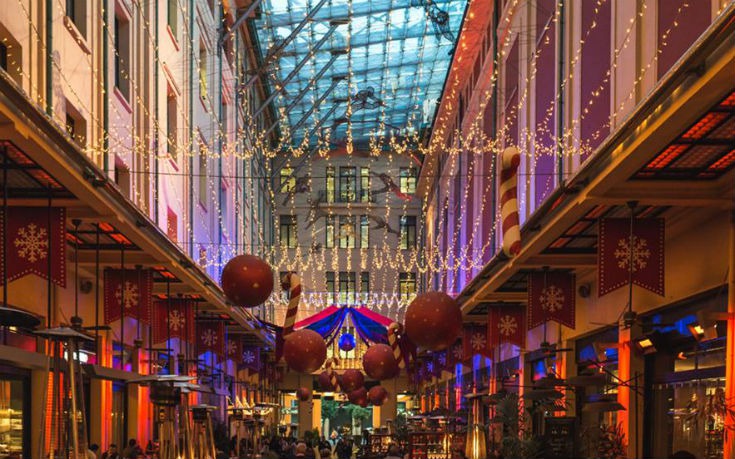 Ζεστός και εκλεπτυσμένος ο στολισμός και στο City Bistro στη στοά Σπύρου Μήλιου στην Αθήνα. Φωτάκια, μπάλες και τόνοι του κόκκινου και του πορτοκαλί χρυσού σε βάζουν σε κλίμα.