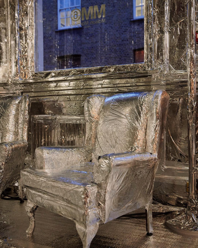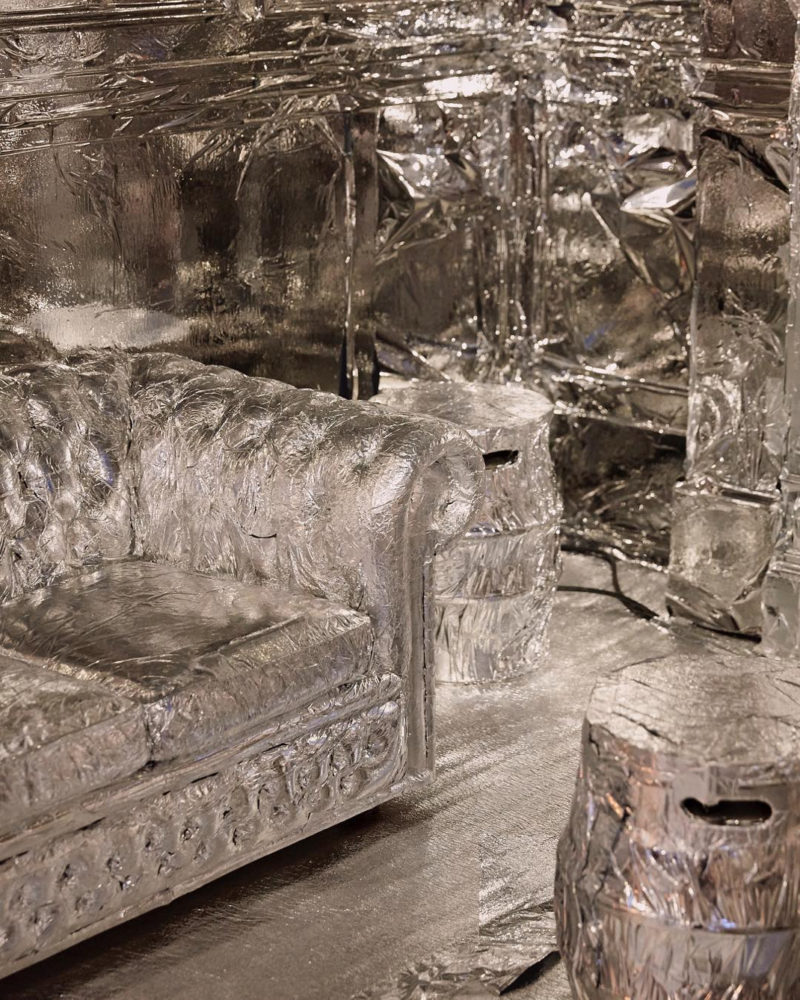 Έτσι, λοιπόν, στο πλαίσιο αυτής της σκέψης, για την παρουσίαση αυτού του οίκου ακόμη και το πιο μικρό στοιχείο και αντικείμενο του χώρου ντύθηκε με αλουμινόχαρτο ώστε να προσδώσει την φουτουριστική διάθεση που επιθυμούσαν οι σχεδιαστές. Από τα τραπέζια και τις καρέκλες μέχρι τα ποτήρια τα πόμολα της πόρτας αλλά και οι καθρέφτες απέκτησαν άλλη όψη ώστε να αντικατοπτρίζουν το κόνσπετ της έκθεσης, δηλαδή ότι κάτι κλασικό και γνωστό μπορεί να μεταμορφωθεί σε κάτι εντελώς διαφορετικό, καινούριο αλλά και μοδάτο όταν ντυθεί με το χρώμα μεταλλικό ασημί.