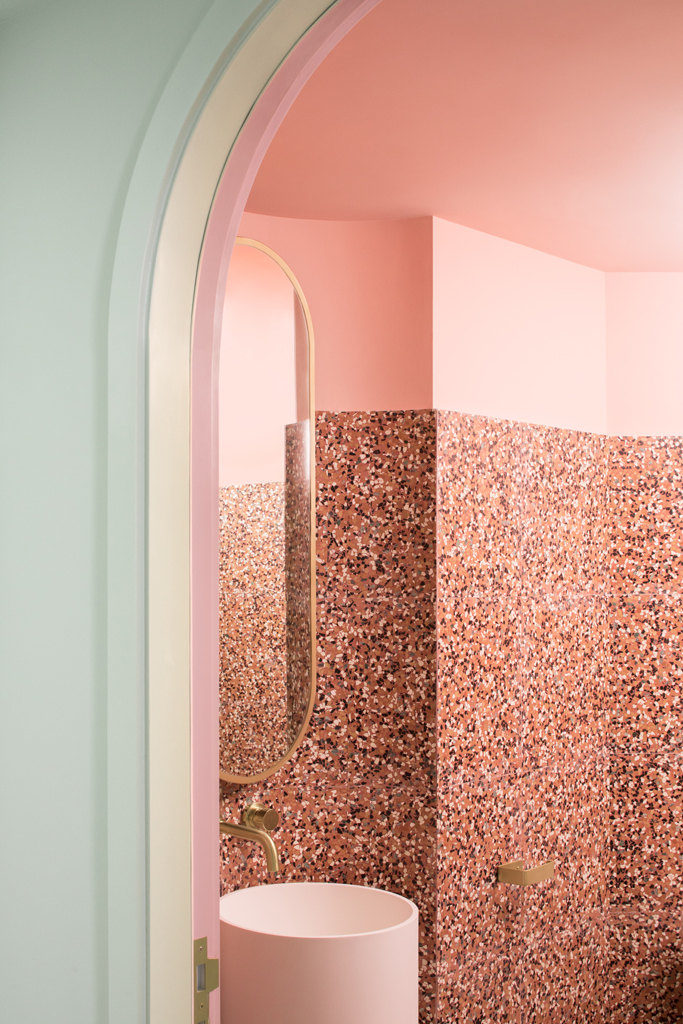 Τα μαλακά παστέλ πράσινα ταιριάζουν με μερικά πιο σκούρα που μοιάζουν με πράσινα δάση. Το Celadon είναι μια ξεχωριστή απόχρωση ανοιχτού πράσινου χρώματος εμπνευσμένη από τα κινεζικά τζάμια, με αποτέλεσμα να γίνεται αντιληπτή μια ισχυρή σχέση μεταξύ του design και της τοποθεσίας. Το πράσινο χρώμα ταιριάζει, επίσης, με το χρυσό ροζ και το παστέλ ροζ: η τουαλέτα είναι συνολικά ροζ και είναι εκπληκτική. Στη συνέχεια τα χρώματα συνδυάζονται με μονόχρωμο μάρμαρο και έγχρωμο μωσαϊκό.