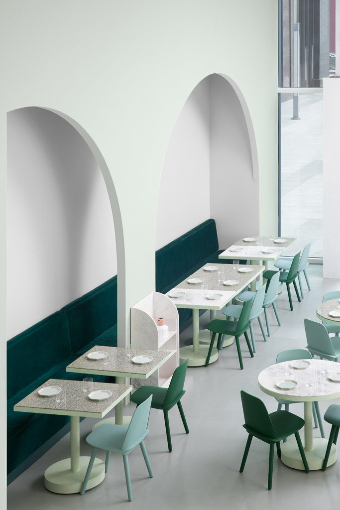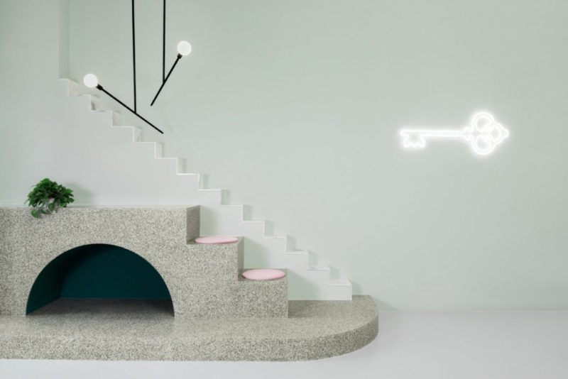 Η διακόσμηση του καφέ μπαρ είναι φρέσκια και σύγχρονη, με μια ιδέα που βασίζεται σε παστέλ χρώματα. Το εσωτερικό του καφέ έχει σχεδιαστεί με καθαρά και εύκολα γεωμετρικά σχήματα, με αναφορά στην αισθητική του Memphis αλλά σε μαλακές και παστέλ αποχρώσεις. Άλλωστε, ένα καλό εσωτερικό design, έχει μια σαφή και ισχυρή ιδέα πίσω από το σχεδιασμό του. Πράγματι, το design αυτής της καφετέριας στην Κίνα είναι σίγουρα ένα καλό παράδειγμα.