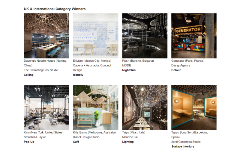Οι κατηγορίες για τις επιχειρήσεις της Μ. Βρετανίας ήταν συνολικά 24 για διαφορετικά βραβεία, όπως τα πιο κλασσικά «καλύτερο μπαρ», «καλύτερη Pub», μέχρι πιο ιδιαίτερες κατηγορίες, όπως το καλύτερο pop – up food store, μαγαζιά με έμφαση στο design του ταβανιού ή καλύτεροι κοινόχρηστοι χώροι (wc, lobby, γκαρνταρόμπα κλπ). Στα βραβεία για τις επιχειρήσεις από τον υπόλοιπο κόσμο οι κατηγορίες ήταν πιο συμβατικές, και συγκεκριμένα το καλύτερο μπαρ και εστιατόριο σε Ευρώπη, Αυστραλία, Ασία, Αμερική και Αφρική.