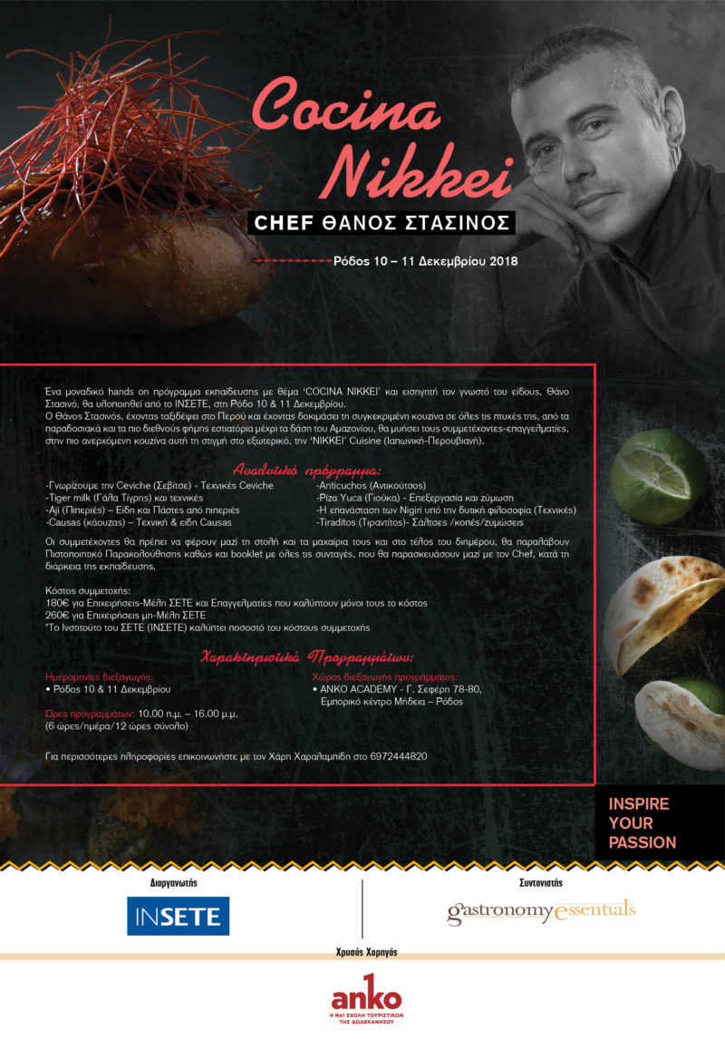 Ένα μοναδικό hands on πρόγραμμα εκπαίδευσης με θέμα ‘COCINA NIKKEI’ και εισηγητή τον γνωστό του είδους, Θάνο Στασινό, θα υλοποιηθεί από το ΙΝΣΕΤΕ, στην Ρόδο στις 10 & 11 Δεκεμβρίου.