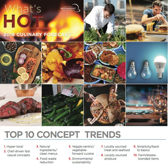 Σύμφωνα με τα αποτελέσματα της ετήσιας έρευνας “What’s Hot”, που συμμετείχαν περίπου 700 σεφ σε όλη τη χώρα και που κυκλοφόρησε τον Δεκέμβριο του 2017, οι 10 πιο “καυτές” εστιατορικές τάσεις είναι:
